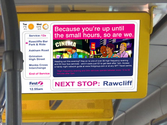 As well as keeping passengers fully informed about their journey and other useful information, the displays have been designed to carry advertising, providing a significant potential income. Advertising messages can easily be adapted to the passenger profile which will vary according to time of day, days of the week, location and other factors, from early morning workers and students to late night clubbers.
